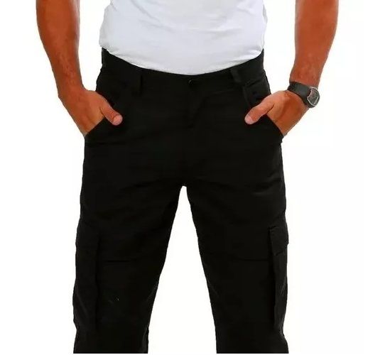 BOLSOS LATERAIS DA PERNA: 2 BOLSOS MEDINDO 18 CM DE LARGURA POR 19 CM DE COMPRIMENTO, COM FOLE DE 4 CM NAS LATERAIS, CHAPADO NA PEÇA, COM LAPELAS MEDINDO 6,5 CM COMPRIMENTO E 18 CM DE LARGURA, COM FECHAMENTO EM VELCRO DE 2,5 CM DE LAGURA E 4 CM DE COMPRIMENTO. LAPELA COM UM PUXADOR DE BORRACHA PARA FACILITAR A ABERTURA DA MESMA.