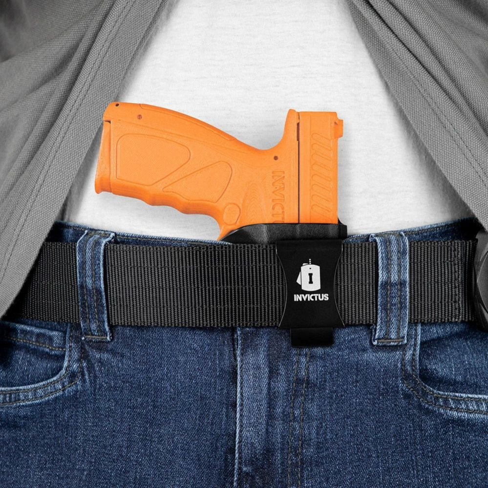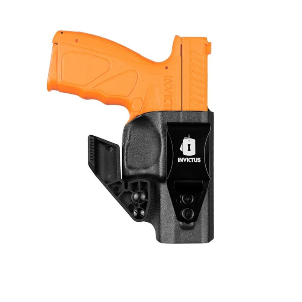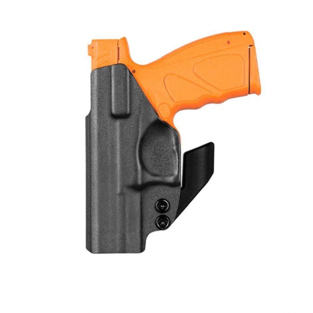 O modelo ainda conta com uma aba dissimuladora de volume, que pode ser retirada se necessário e retida do guarda mata ajustável. Um kit extra de parafusos é fornecido para caso desejar utilizar o coldre sem a aba dissimuladora de volume.