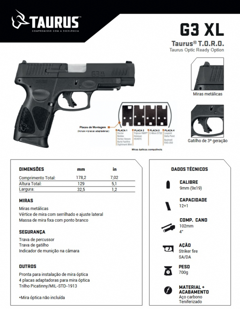 A pistola Taurus G3 XL T.O.R.O. é equipada com o revolucionário sistema Taurus Optic Ready Option (T.O.R.O.) permitindo acoplar facilmente, com placas intercambiáveis, uma ampla gama de miras ópticas, sem a necessidade do trabalho customizado de um armeiro. A nova pistola G3 XL T.O.R.O. possui trilho MIL-STD-1913 Picatinny para montagem de acessórios, como lanterna tática ou laser, e recursos de segurança, entre eles o indicador visual de munição na câmara, o sistema de gatilho de ação simples e dupla, e as travas de percussor e de gatilho.