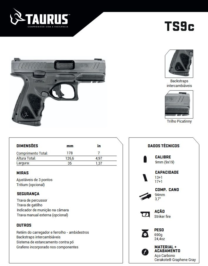 A Pistola Taurus TS9c Graphene é a primeira compacta com grafeno na composição. Indicada para uso policial, militar, pessoal e residencial. A pistola TS9c Graphene é ideal para as mais adversas situações, unindo resistência, qualidade e durabilidade à tecnologia e benefícios oferecidos pelo grafeno.